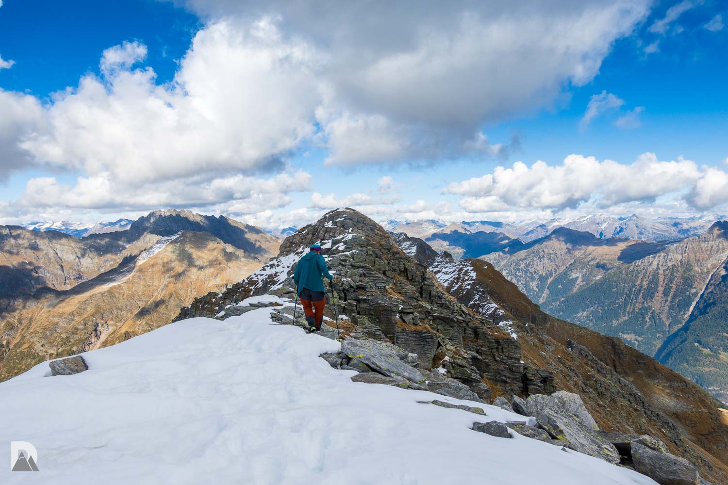 Am Hauptgipfel angekommen, war die Sicht fantastisch – rundum Stille und Weite. Doch die Zeit drängte, es war fast drei Uhr. Der Abstieg über die Nordostflanke war gut markiert, und Spuren im Schnee erleichterten die Orientierung. Auf etwa 2150 m versuchten wir, möglichst auf gleicher Höhe zu bleiben, um zusätzliche Höhenmeter zu vermeiden – alte SIMM-Gewohnheit.