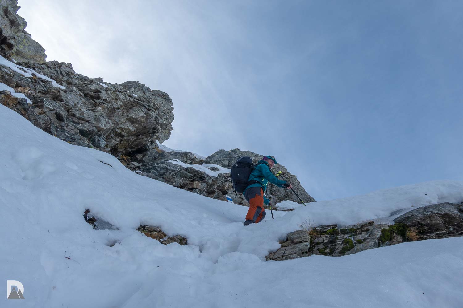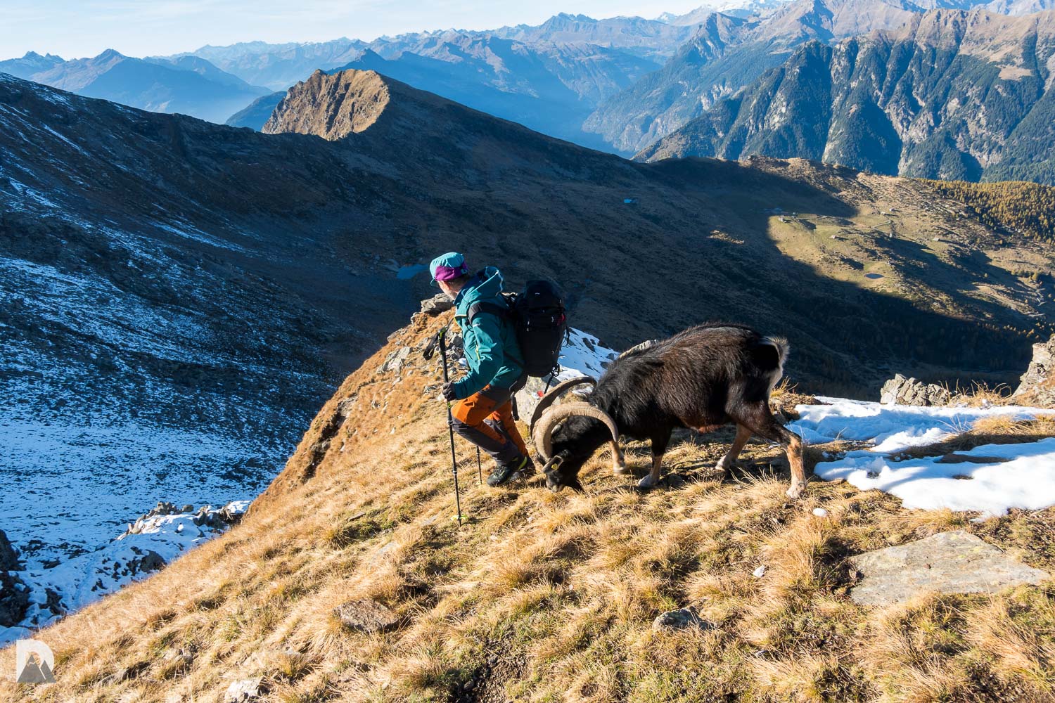 Über den Passo del Mauro (2427 m) begegneten wir einer Herde Ziegen, die sich streicheln liessen – nur der Bock roch furchtbar, also nahmen wir schnell Reissaus. Der Abstieg nach Norden war heikel: steil, vereist und ausgesetzt – sicher T4+ bei Trockenheit.
