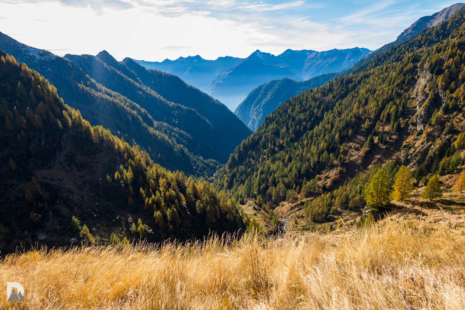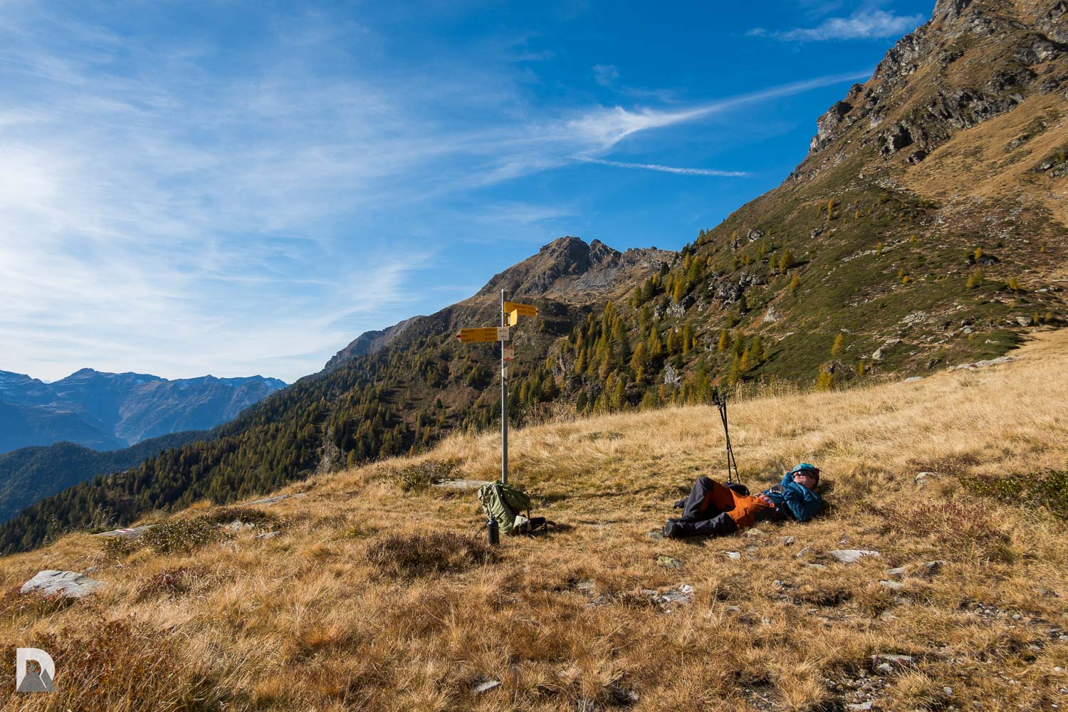 Von dort führte der Weg durch einen goldenen Herbstwald hinauf zur Capanna Brogoldone (1907 m). Die Hütte war noch geöffnet, aber nur bis zum Wochenende – danach würde sie in die Winterpause gehen, so wie auch die nächsten beiden auf unserer Route.