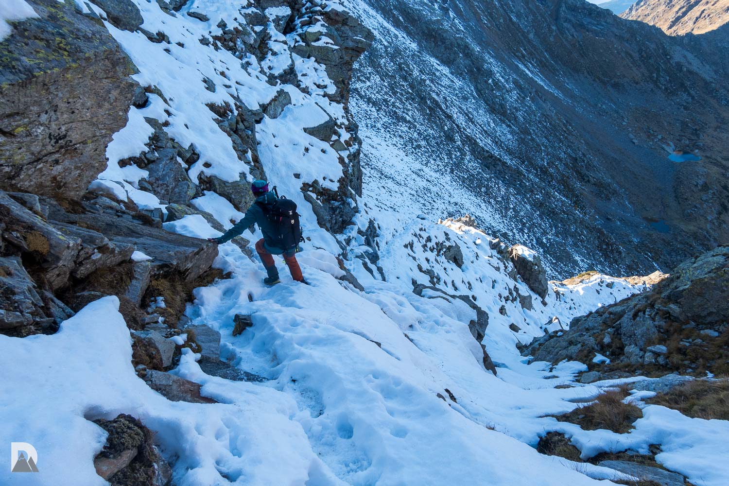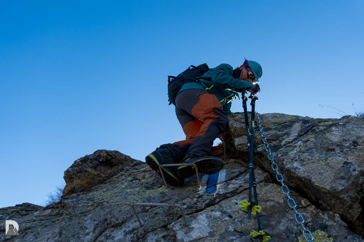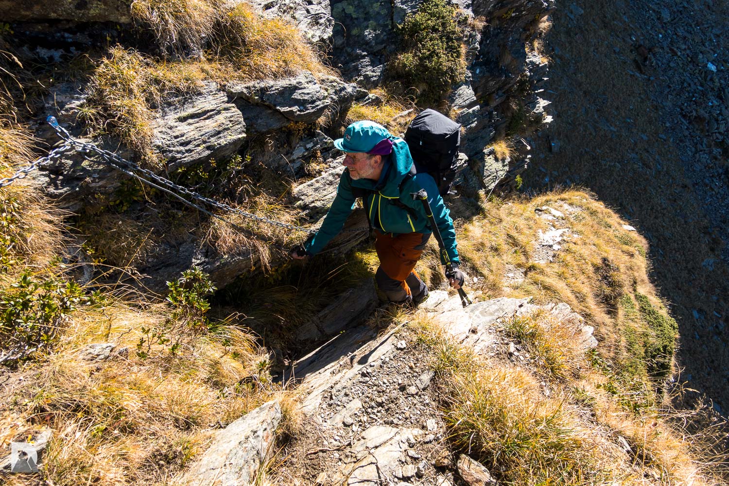 Von der Hütte aus sahen wir fast die ganze Strecke. Zuerst ging es hinunter zur Alpe di Sceng di Sopra (1787 m), dann wechselten wir auf den blau-weiss markierten Weg. Der Aufstieg war spannend – ausgesetzt, aber gut mit Seilen und Kabeln gesichert, und glücklicherweise schneefrei.